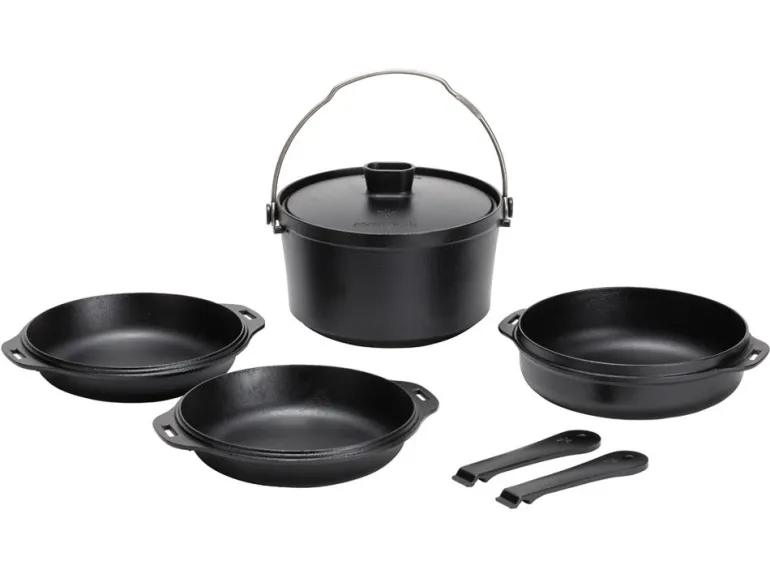 The set is a versatile option for cooking at home or over the campfire. The Cast Iron Duo includes a cast iron pot, lid, skillet, two plates, handles and storage case. The Cast Iron Duo pairs well with the Takibi Fire & Grill.