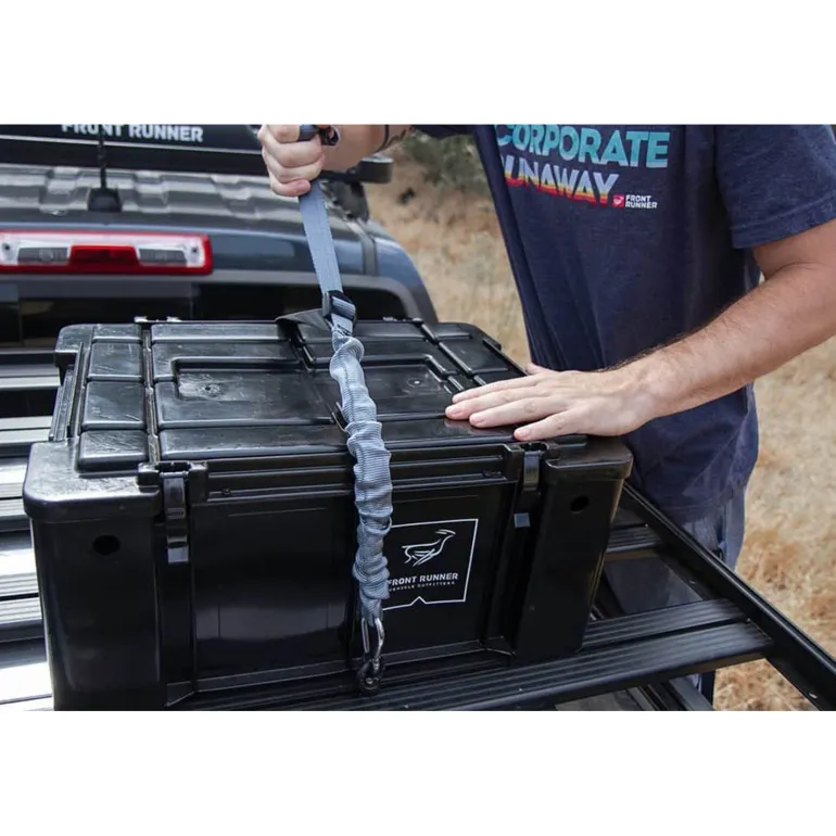 Hook to the Front Runner Roof Rack Tie Down Ring or loop around the slats or side profiles and fasten the Stratchit Shortie to itself.