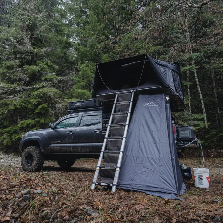 The LNT Overland shower tent is designed for compatibility with the iKamper all Skycamp rooftop tents series(Skycamp 3.0, Skycamp 2.0, and mini). It’s a lightweight, compact, bag-type product that can be easily installed under the rooftop, offering a convenient setup.