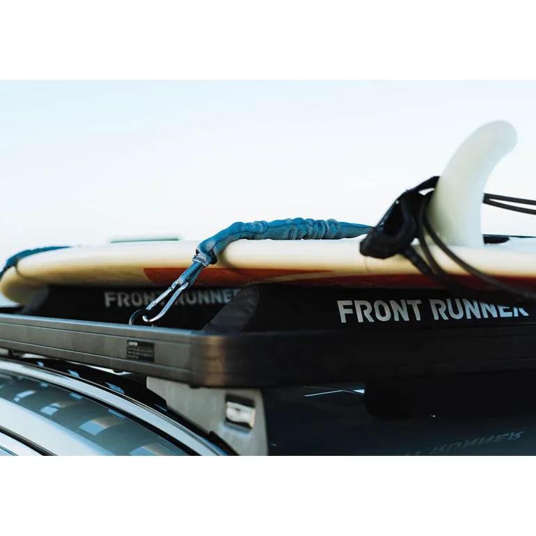 Hook to the Front Runner Roof Rack Tie Down Ring or loop around the slats or side profiles and fasten the Stratchit Shortie to itself.